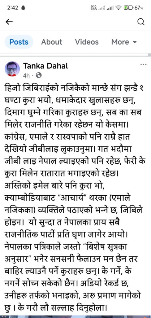 ✍🏿टंक दाहाल, “हिजो जिबिराईको नजिकैको मान्छे संग झन्डै १ घण्टा कुरा भयो, धमाकेदार खुलासहरु छन्, दिमाग घुम्ने गरिका कुराहरु छन्, सब का सब मिलेर राजनीति गरेका रहेछन यो केसमा। कांग्रेस, एमाले र रास्वपाको पनि राम्रै हात देखियो जीबीलाइ लुकाउनुमा। गत भदौमा जीबी लाइ नेपाल ल्याइएको पनि रहेछ, फेरी के कुरा मिलेन रातारात भगाइएको रहेछ। अस्तिको इमेल बारे पनि कुरा भो, क्याम्बोडियाबाट “आचार्य” थरका (एमाले नजिकका) व्यक्तिले पठाएको भन्ने छ, जिबिले होइन।  यो सुन्दा त नेपालका प्राय सबै राजनीतिक पार्टी प्रति घृणा जागेर आयो। नेपालका पत्रिकाले जस्तो “बिशेष सुत्रका अनुसार” भनेर सनसनी फैलाउन मन छैन तर बाहिर ल्याउनै पर्ने कुराहरु छन्। के गर्ने, के नगर्ने सोच्न सकेको छैन। अडियो रेकर्ड छ, उनीहरु तर्फको भनाइको, अरु प्रमाण मागेको छु । के गरौ लौ सल्लाह दिनुहोला।”