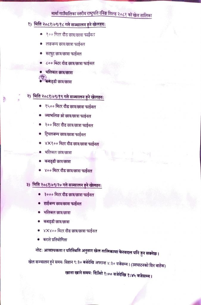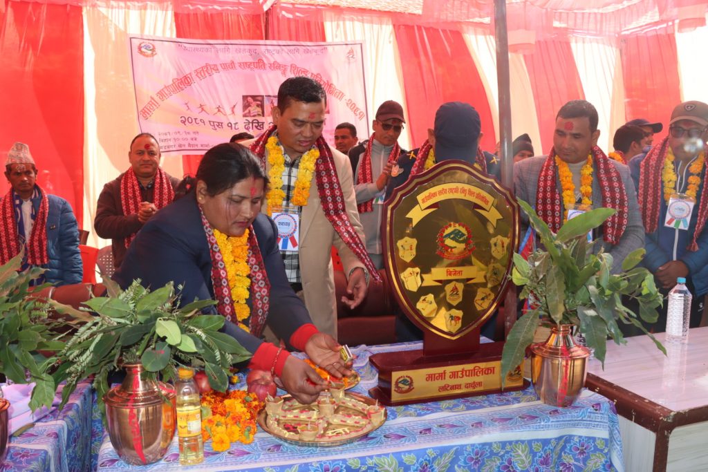 मार्मा गाउँपालिका अध्यक्ष एवम् पाचौं राष्ट्रपति रनिङ सिल्ड प्रतियोगिता -२०८१ पुस १८ देखि २० सभाका अध्यक्ष जमन सिंह धामी ले प्रतियोगिताको समुद्घाटन गरेको मार्मा गाउँपालिका शिक्षा शाखा प्रमुख राजेन्द्र जोशीले जानकारी दिएका छन्।