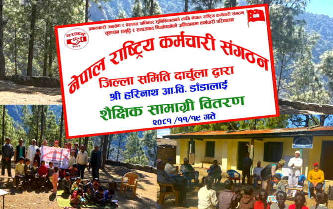 पुरा पढ्नुहोसराकस दार्चुलाले गर्यो विद्यालयलाई शैक्षिक सामाग्री सहयोग १९ फागुन २०८१, दार्चुला : नेपाल राष्ट्रिय कर्मचारी संगठन (निजामती) दार्चुलाले विद्यालयलाई शैक्षिक सामग्री सहयोग गरेको छ । महाकाली नगरपालिका-८ स्थित हरिनाथ आधारभूत विद्यालय डाँडालाई शैक्षिक सामग्री...