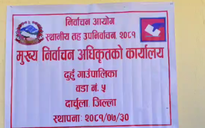 पुरा पढ्नुहोसदुहुँ गाउँपालिका: वडा अध्यक्षका लागि ४ जनाको मनोनयन२ मंसिर २०८१ दार्चुला ।जिल्लाको दुहु गाउँपालिका वडा नम्बर ५ को वडा अध्यक्षका लागि ३ दलका सहित ४ जनाले मनोनयन दर्ता गराएका छन् ।मुख्य निर्वाचन अधिकृतको कार्यालयका...