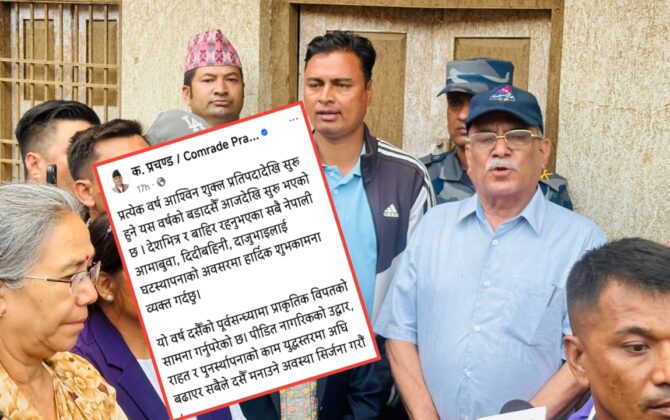 पुरा पढ्नुहोसयो पालिको बडादशैं राहात र पुनर्स्थापनामा जोड दिई मनाऔं – प्रचण्ड बडादशैंको शुभकामना दिँदै पूर्व प्रधानमन्त्री पुष्पकमल दाहाल प्रचण्डले विपद्को सामना गर्दै राहत र पुनर्स्थापनाको काम युद्धस्तरमा अघि बढाएर दशैँ मनाउन आग्रह गरेका छन्।...